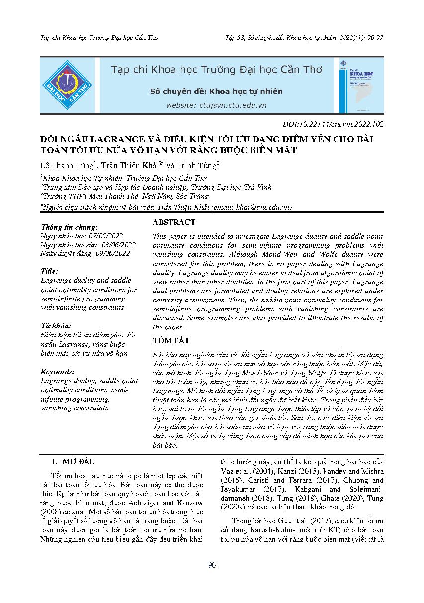 Đối ngẫu lagrange và điều kiện tối ưu dạng điểm yên cho bài toán tối ưu nửa vô hạn với ràng buộc biến mất = Lagrange duality and saddle point optimality conditions for semi-infinite programming with vanishing constraints