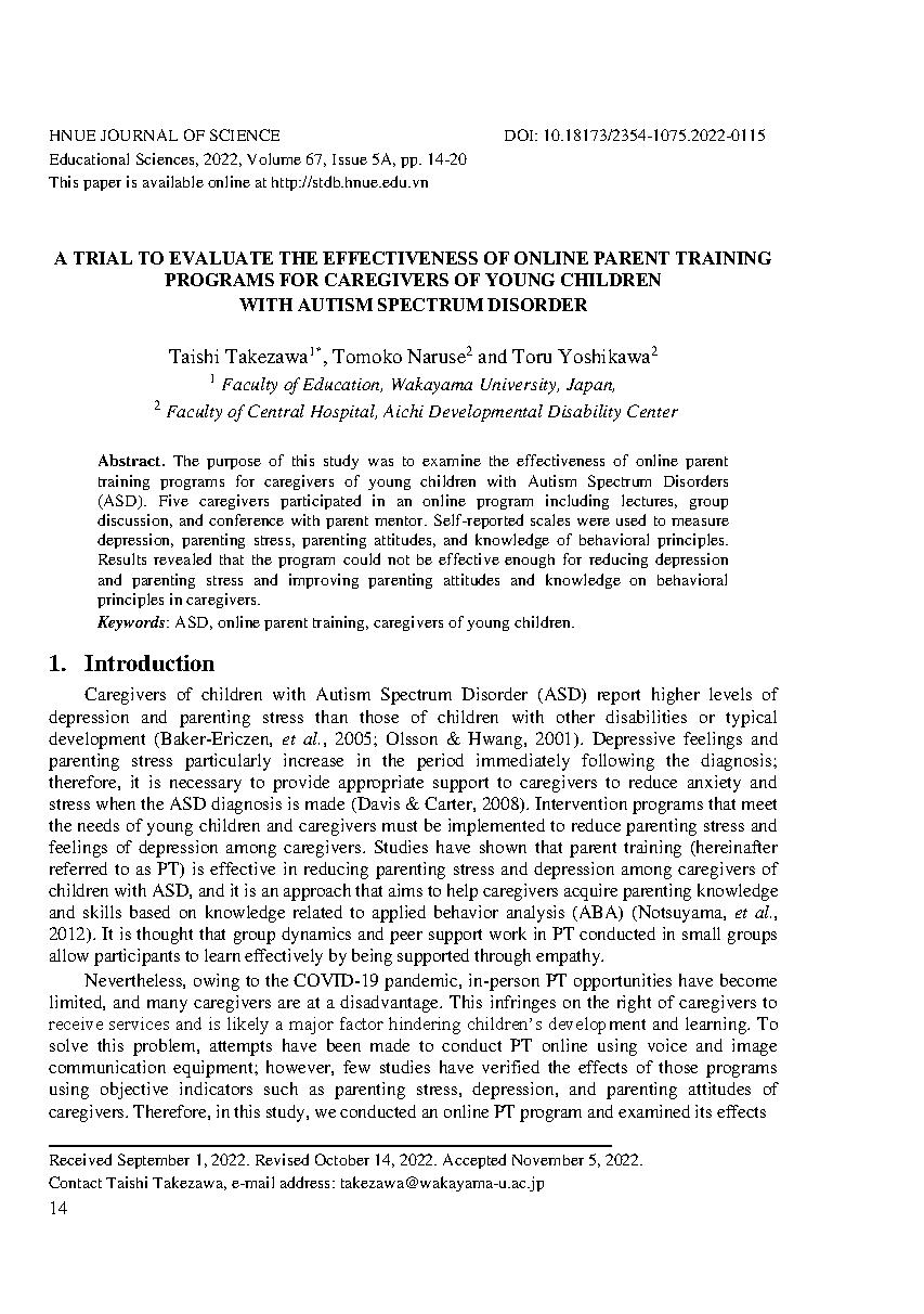 Một thử nghiệm để đánh giá hiệu quả của các chương trình đào tạo phụ huynh trực tuyến dành cho người chăm sóc trẻ nhỏ mắc chứng rối loạn phổ tự kỷ = A trial to evaluate the effectiveness of online parent training Programs for caregivers of young children