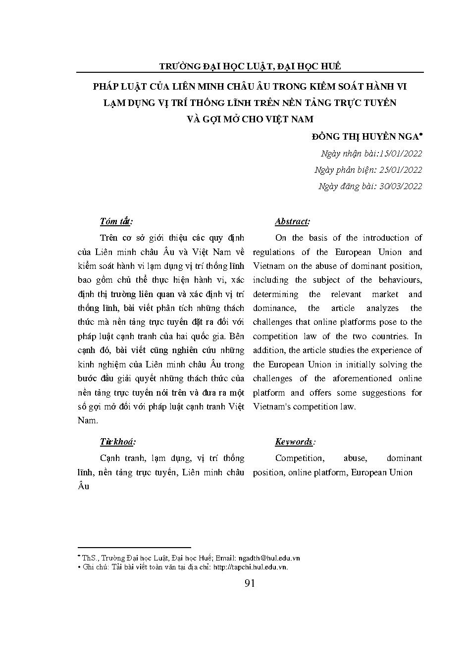 Pháp luật của liên minh châu âu trong kiểm soát hành vi lạm dụng vị trí thống lĩnh trên nền tảng trực tuyến và gợi mở cho Việt Nam = Legislation of the European Union in controlling abuse of dominant position on online platforms and suggestive for Vietnam