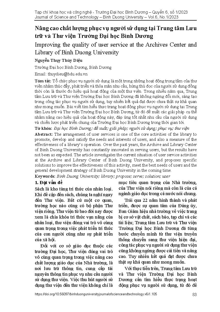 Nâng cao chất lượng phục vụ người sử dụng tại Trung tâm Lưu trữ và Thư viện Trường Đại học Bình Dương = Improving the quality of user service at the Archives Center and Library of Binh Duong University