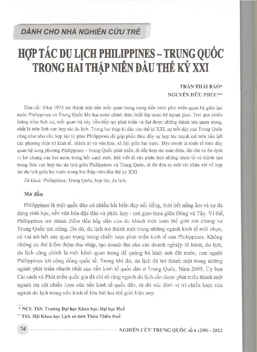 Hợp tác du lịch Philippines - Trung Quốc trong hai thập niên đầu thế kỷ XXI = The Philippines - China cooperation in tourism in the first two decades of the 21st century