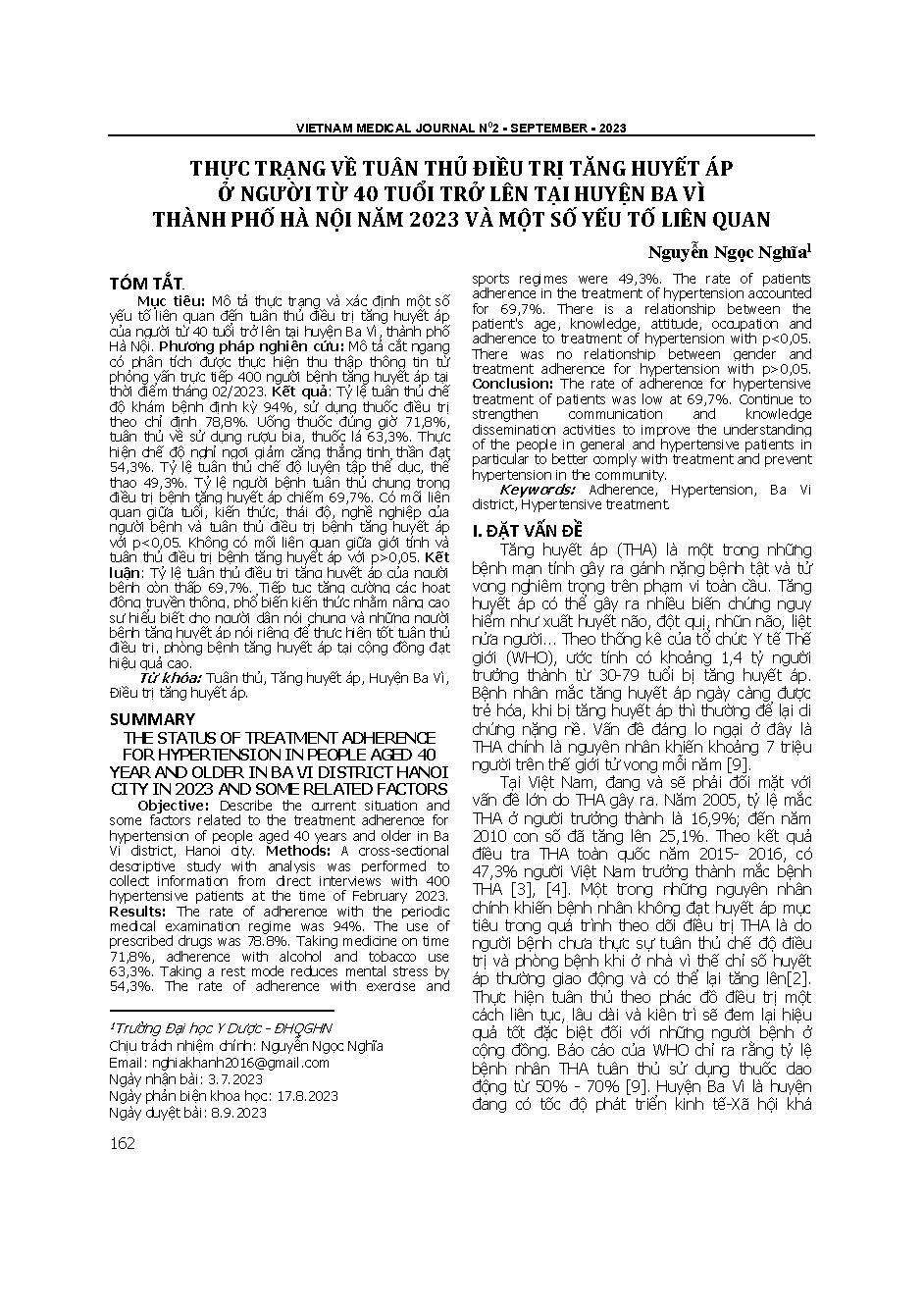Thực trạng về tuân thủ điều trị tăng huyết áp ở người từ 40 tuổi trở lên tại huyện ba vì thành phố Hà Nội năm 2023 và một số yếu tố liên quan = The status of treatment adherence for hypertension in people aged 40 year and older in ba vi district hanoi cit