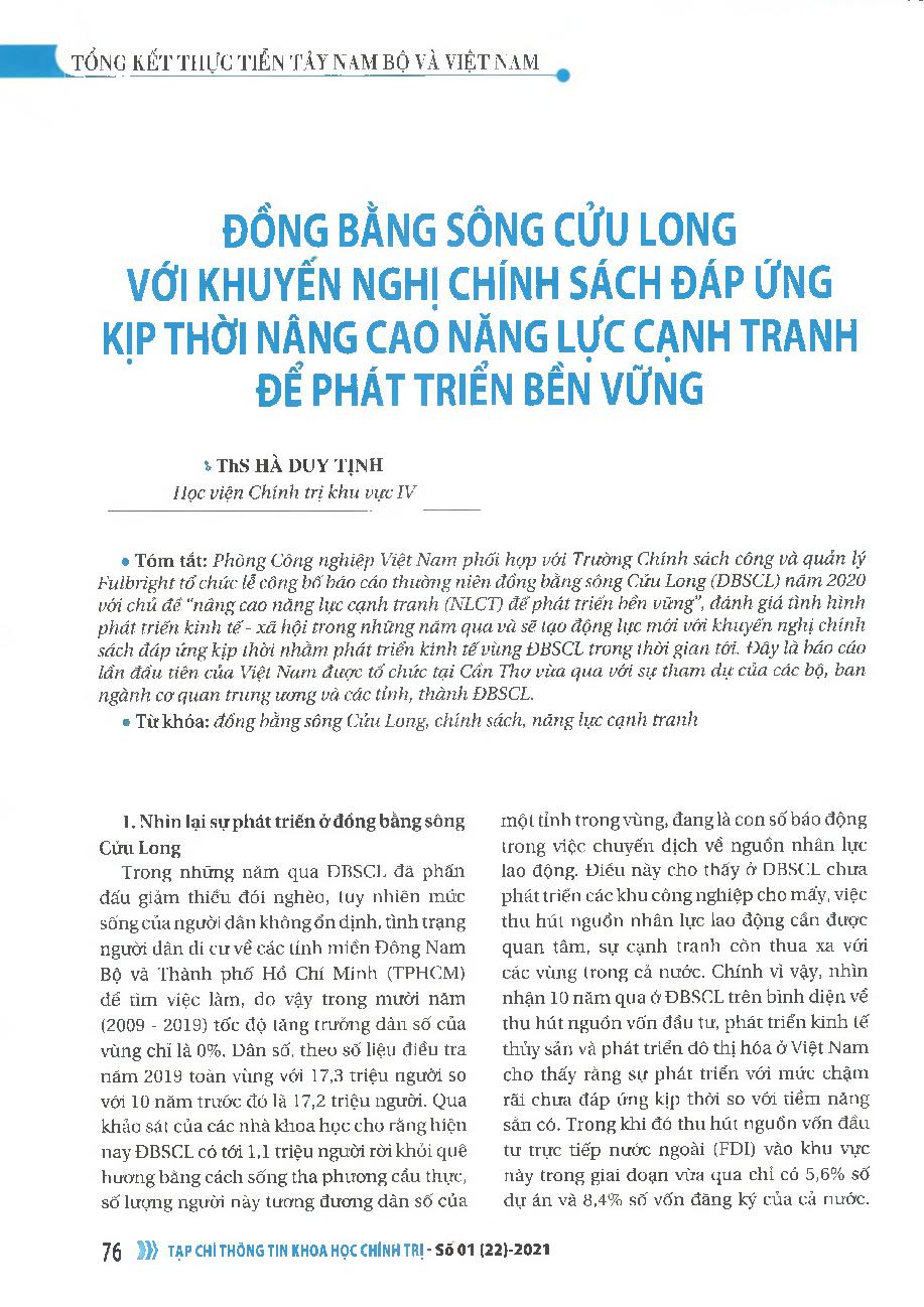 Đồng bằng sông Cửu Long với khuyến nghị chính sách đáp ứng kịp thời nâng cao năng lực cạnh tranh để phát triển bền vững