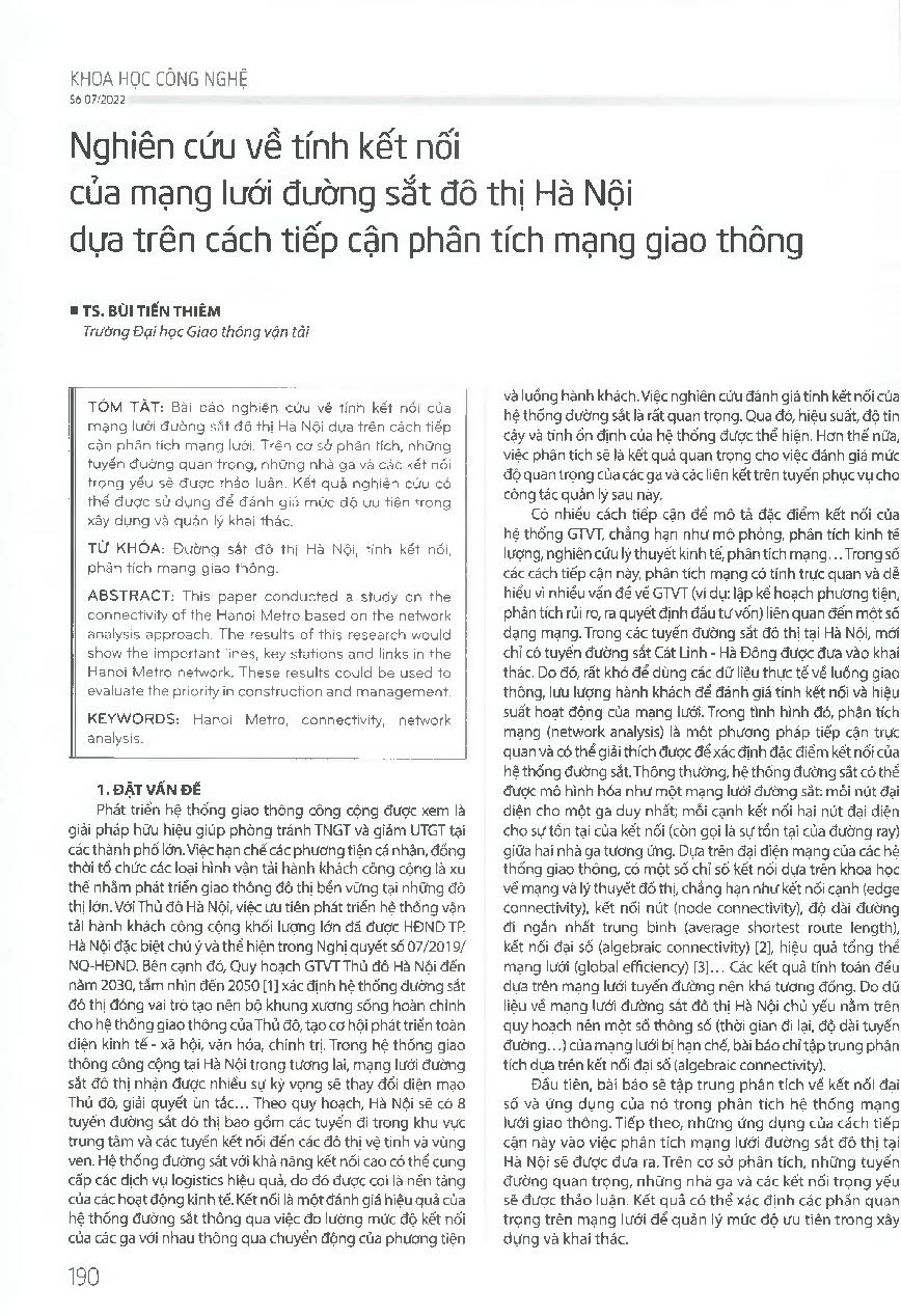 Nghiên cứu về tính kết nối của mạng lưới đường sắt đô thị Hà Nội dựa trên cách tiếp cận phân tích mạng giao thông