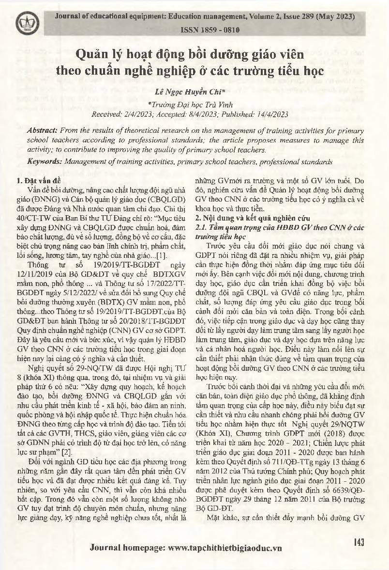 Quản lý hoạt động bồi dưỡng giáo viên theo chuẩn nghề nghiệp ở các trường tiểu học = Managing teacher training activities according to professional standards in primary schools