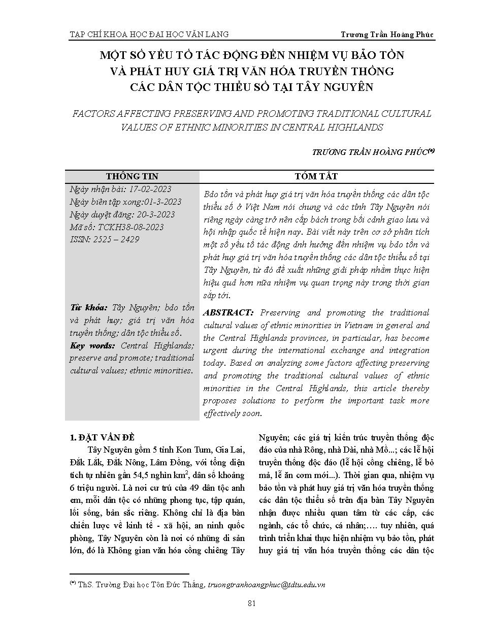 Một số yếu tố tác động đến nhiệm vụ bảo tồn và phát huy giá trị văn hóa truyền thống các dân tộc thiểu số tại Tây Nguyên = Factors affecting preserving and promoting traditional cultural values of ethnic minorities in Central Highlands
