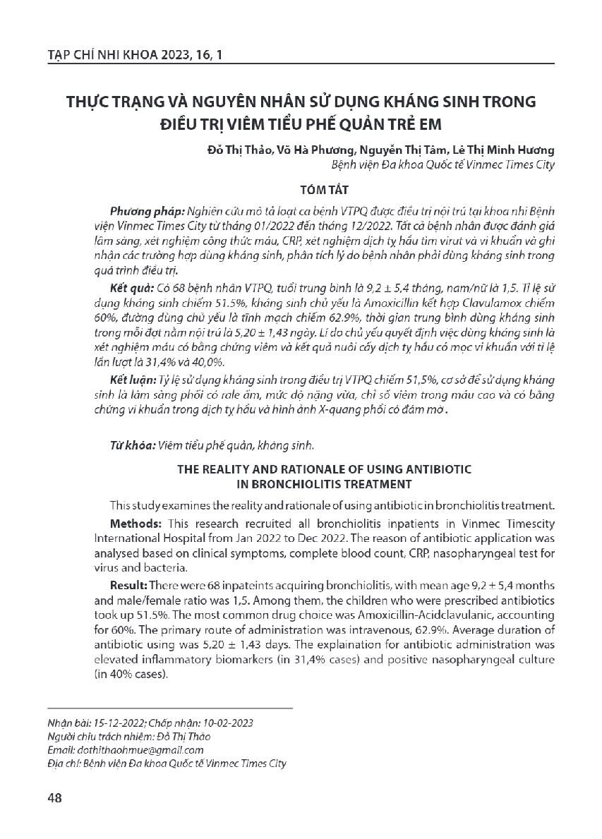 Thực trạng và nguyên nhân sử dụng kháng sinh trong điều trị viêm tiểu phế quản trẻ em = The reality and rationale of using antibiotic in bronchiolitis treatment