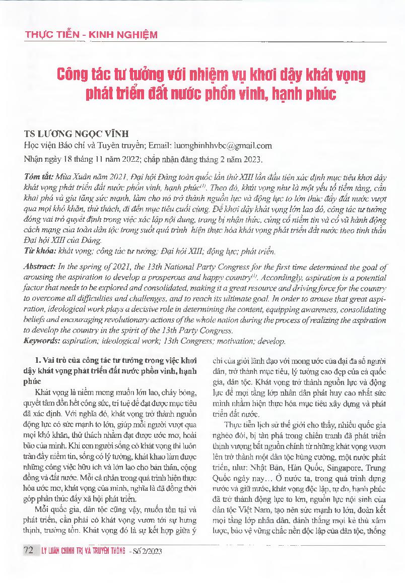Công tác tư tưởng với nhiệm vụ khơi dậy khát vọng phát triển đất nước phồn vinh, hạnh phúc = Ideological work and the task of arousing the aspiration for national development
