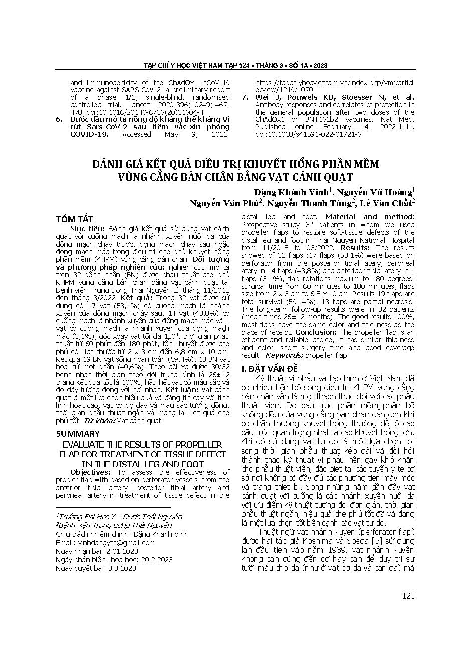 Đánh giá kết quả điều trị khuyết hổng phần mềm vùng cẳng bàn chân bằng vạt cánh quạt = Evaluate the results of propeller flap for treatment of tissue defect in the distal leg and foot