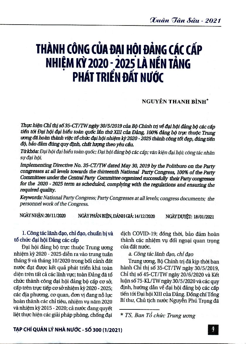 Thành công của đại hội đảng các cấp nhiệm kỳ 2020 - 2025 là nền tảng phát triển đất nước = The success of the party congresses at all levels for the 2020-2025 term is the foundation for the development of the country