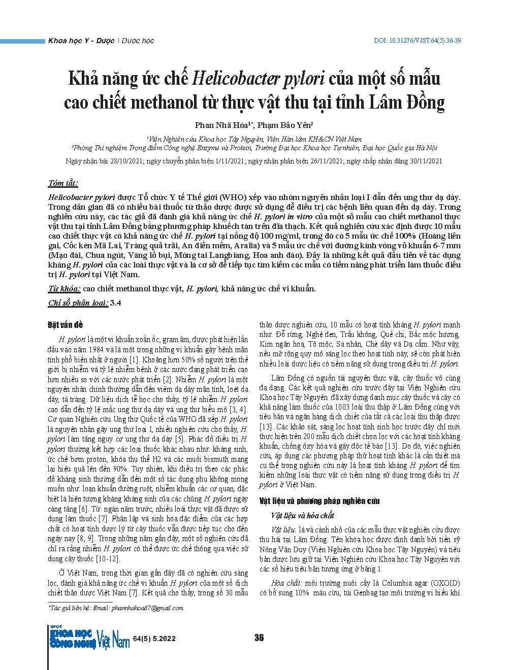 Khả năng ức chế Helicobacter pylori của một số mẫu cao chiết methanol từ thực vật thu tại tỉnh Lâm Đồng = Inhibitory effects on Helicobacter pylori of methanol extracts from plants collected inLam Dong province