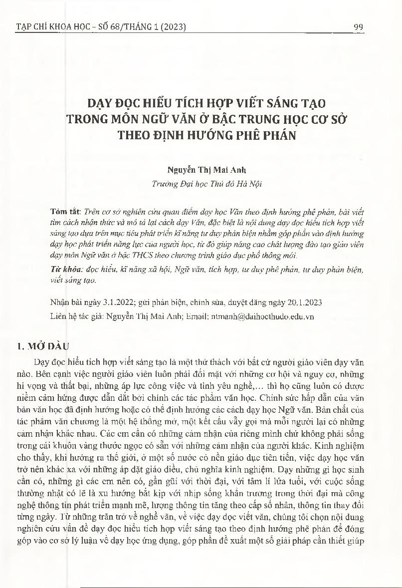 Dạy đọc hiểu tích hợp viết sáng tạo trong môn ngữ văn ở bậc trung học cơ sở theo định hướng phê phán = Teaching comprehensive reading intergrating with writing and teaching creative writing in literature at the secondary school level with a critical think