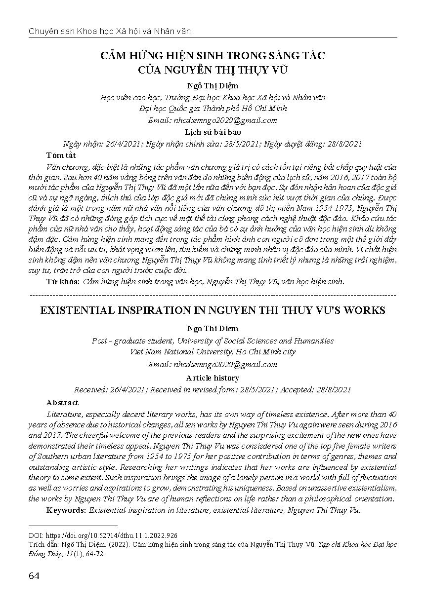 Cảm hứng hiện sinh trong sáng tác của Nguyễn Thị Thụy Vũ = Existential inspiration in Nguyen Thi Thuy Vu&; 39;s works
