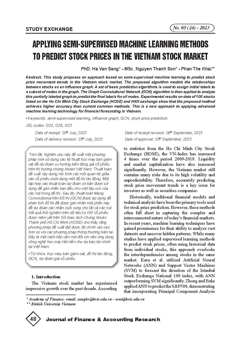 Ứng dụng phương pháp học máy bán giám sát để dự đoán giá cổ phiếu trên thị trường chứng khoán Việt Nam = Applying semi-supervised machine learning methods to predict stock prices in the Vietnam stock market