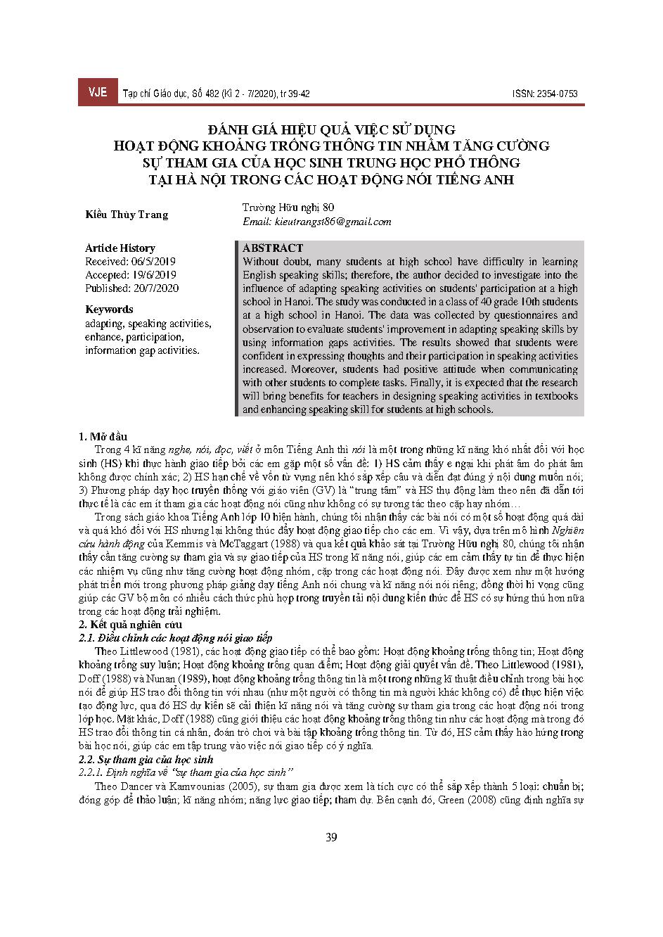 Đánh giá hiệu quả việc sử dụng hoạt động khoảng trống thông tin nhằm tăng cường sự tham gia của học sinh trung học phổ thông tại hà nội trong các hoạt động nói tiếng Anh = Evaluate the effectiveness of using information gaps to increase the participation of high school students in Hanoi in English speaking activities
