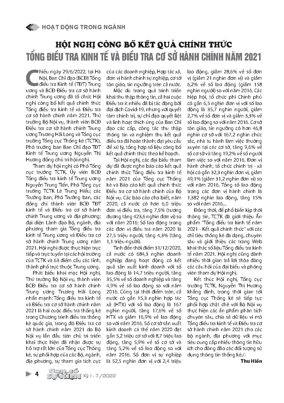 Hội nghị công bố kết quả chính thức Tổng điều tra kinh tế và Điều tra cơ sở hành chính năm 2021 = Conference to announce official results of Economic Census and Census of Administrative Establishments in 2021