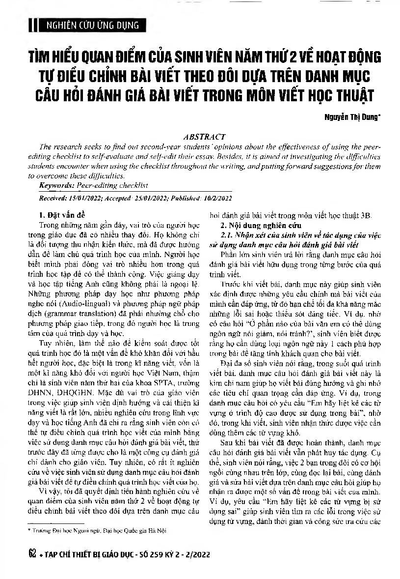 Tìm hiểu quan điểm của sinh viên năm thứ 2 về hoạt động tự điều chỉnh bài viết theo đôi dựa trên danh mục câu hỏi đánh giá bài viết trong môn Viết học thuật = Finding out the views of 2nd year students on self-editing activities in pairs based on essay as