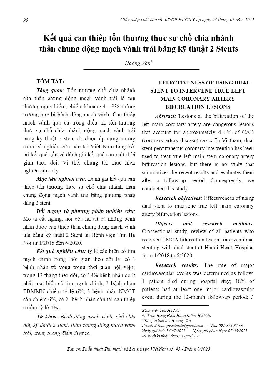 Kết quả can thiệp tổn thương thực sự chỗ chia nhánh thân chung động mạch vành trái bằng kỹ thuật 2 Stents = Effectiveness of using dual stent to intervene true left Main coronary artery bifurcation lesions