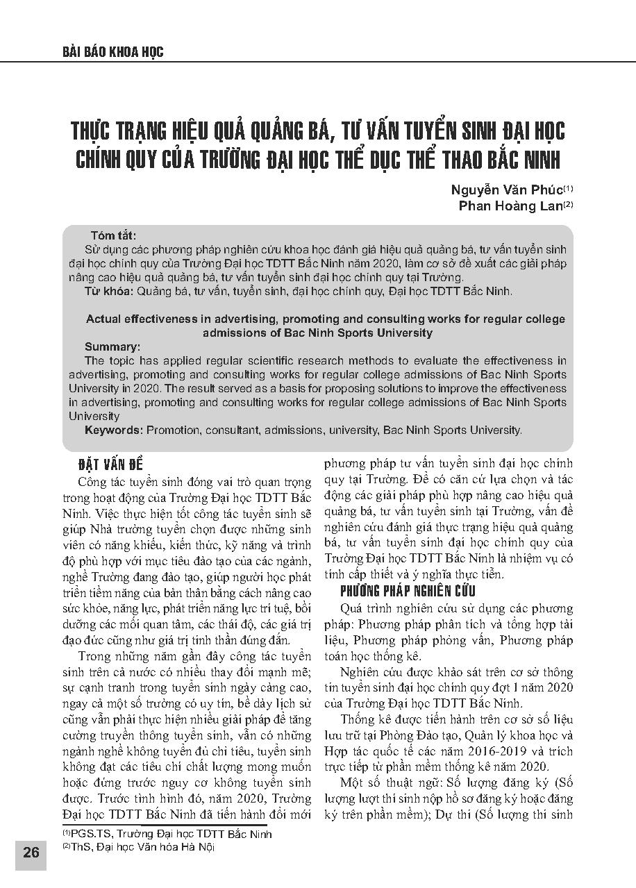 Thực trạng hiệu quả quảng bá, tư vấn tuyển sinh đại học chính quy của Trường Đại học Thể dục thể thao Bắc Ninh = Actual effectiveness in advertising, promoting and consulting works for regular college admissions of Bac Ninh Sports University
