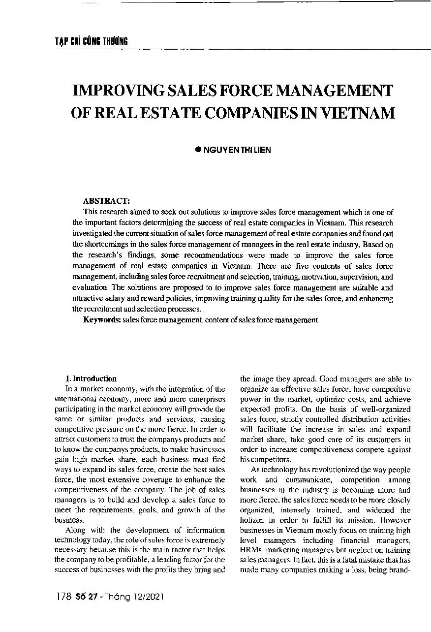 Nâng cao hiệu quả quản trị lực lượng bán hàng tại các doanh nghiệp kinh doanh bất động sản tại Việt Nam = Improving sales force management of real estate companies in Vietnam