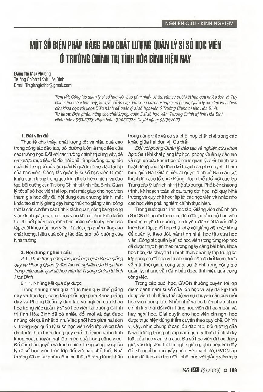 Một số biện pháp nâng cao chất lượng quản lý sĩ số học viên ở Trường Chính trị tỉnh Hòa Bình hiện nay = Some measures to improve the quality of the student management at the Political School, Hoa Binh province