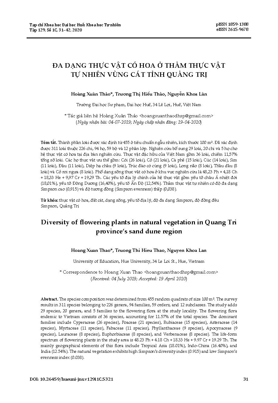 Đa dạng thực vật có hoa ở thảm thực vật tự nhiên vùng cát tỉnh Quảng Trị = Diversity of flowering plants in natural vegetation in Quang Tri province’s sand dune region