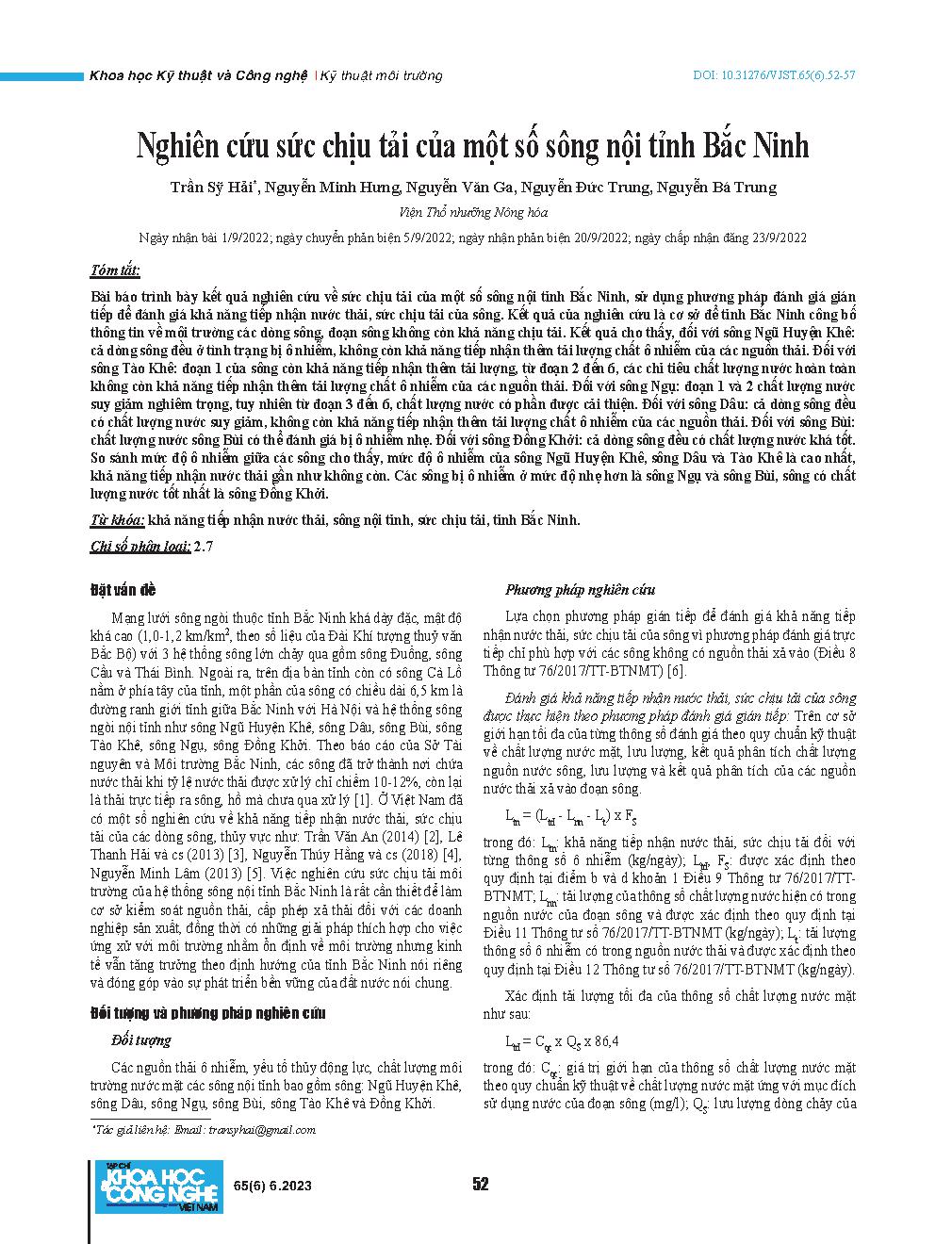 Nghiên cứu sức chịu tải của một số sông nội tỉnh Bắc Ninh = Research on the carrying capacity of intra-provincial rivers in Bac Ninh province