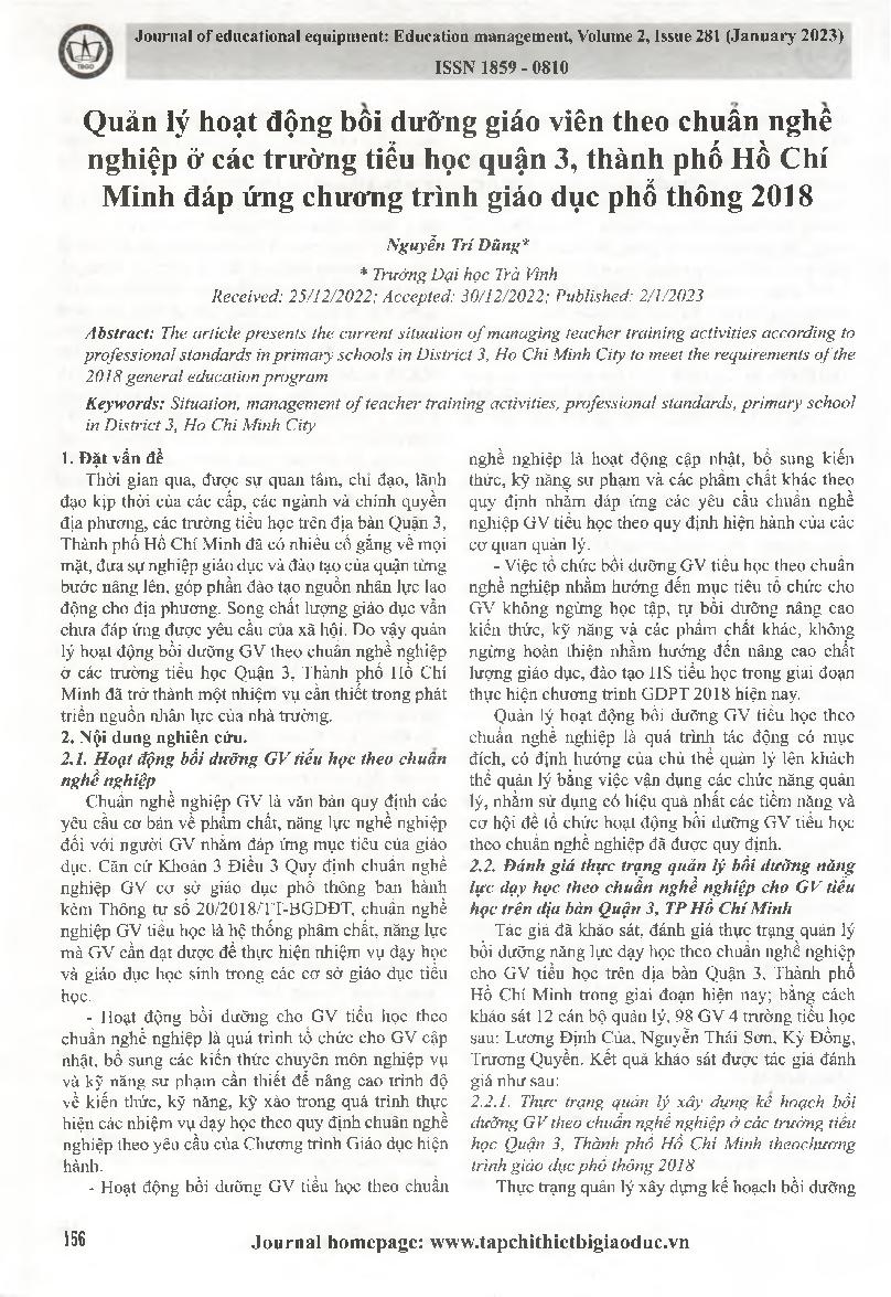 Quản lý hoạt động bồi dưỡng giáo viên theo chuẩn nghề nghiệp ở các trường tiểu học quận 3, thành phố Hồ Chí Minh đáp ứng chương trình giáo dục phố thông 2018 = Managing teacher training activities according to professional standards in primary schools in