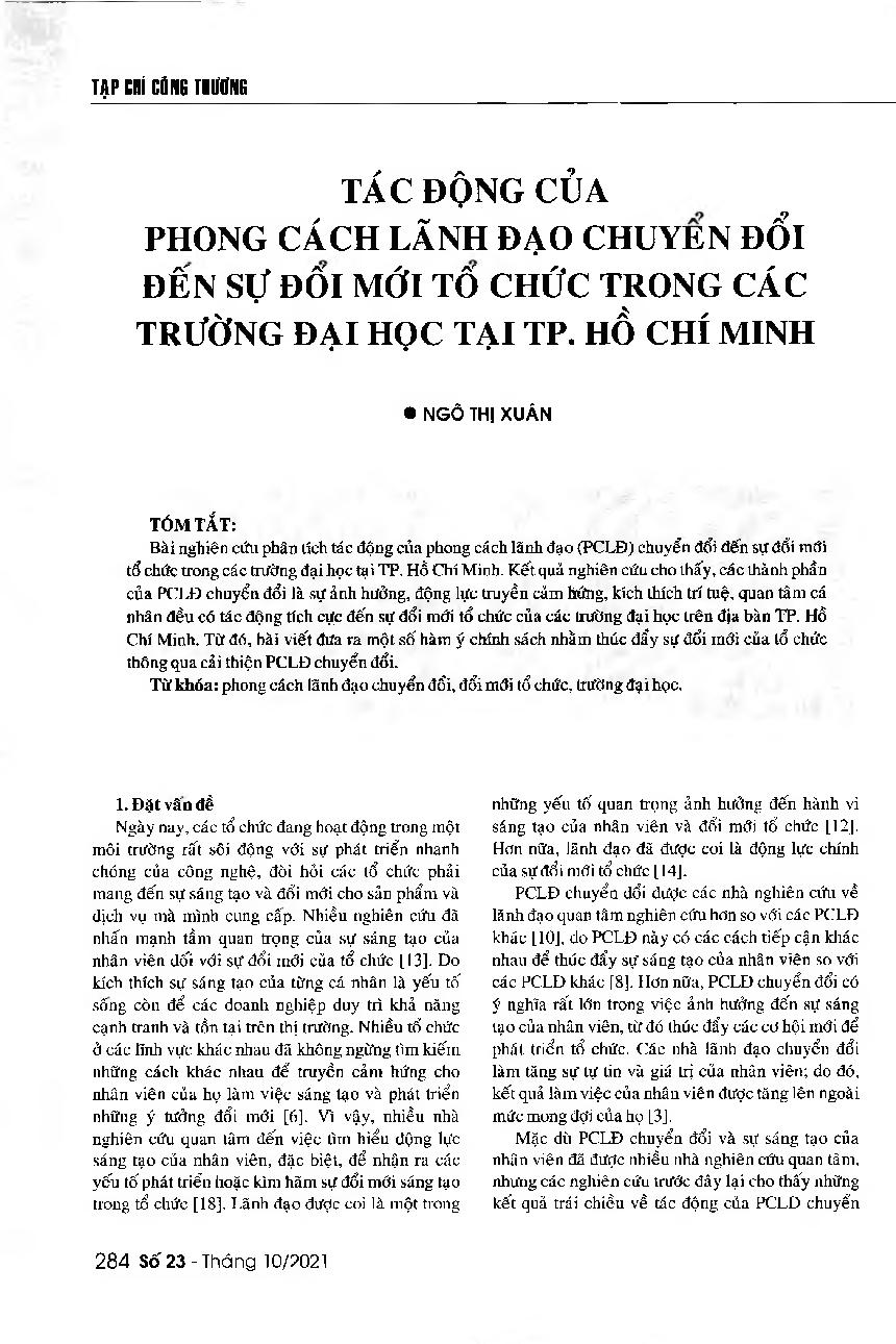 Tác động của phong cách lãnh đạo chuyển đổi đến sự đổi mới tổ chức trong các trường đại học tại TP. Hồ Chí Minh = Impacts of transformational leadership style on organizational innovation in universities located in Ho Chi Minh City
