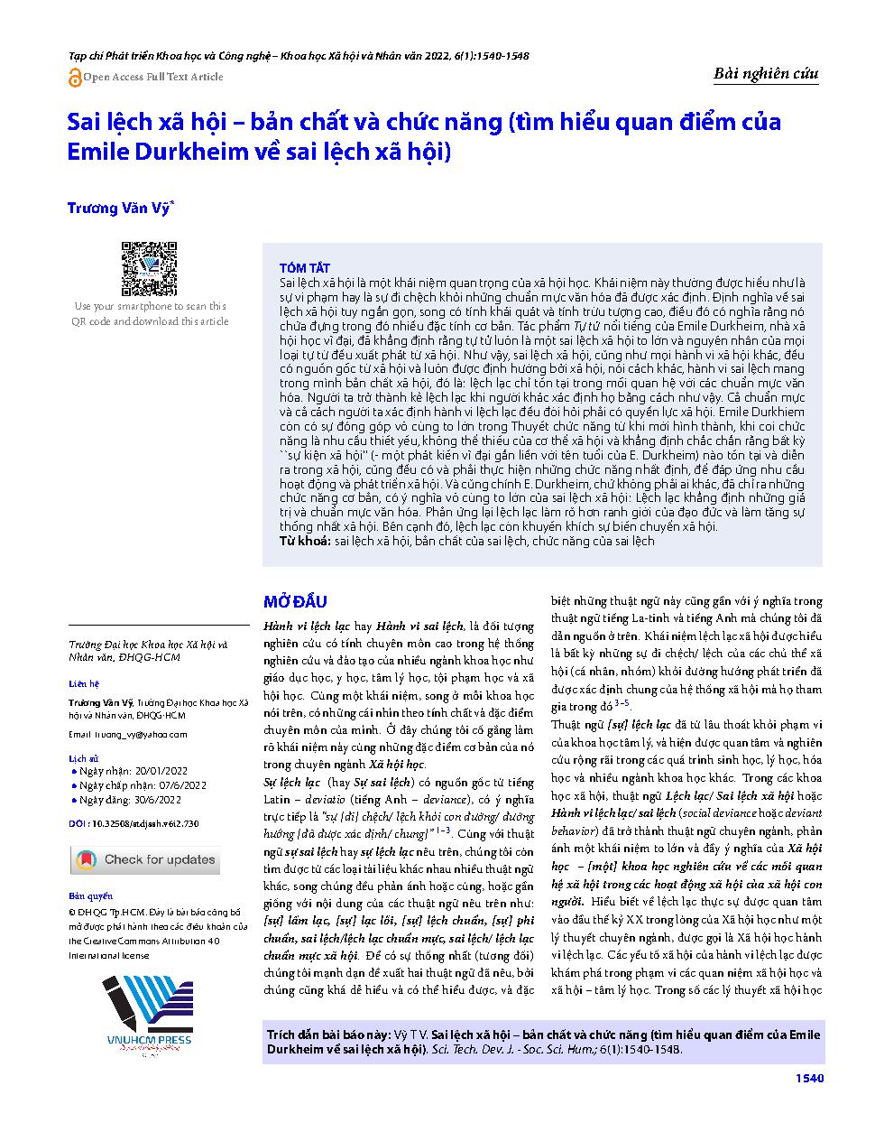Sai lệch xã hội – bản chất và chức năng (tìm hiểu quan điểm của Emile Durkheim về sai lệch xã hội) = The social deviance – the nature and the function (Finding out Emile Durkheim’s point of view to the social deviance)