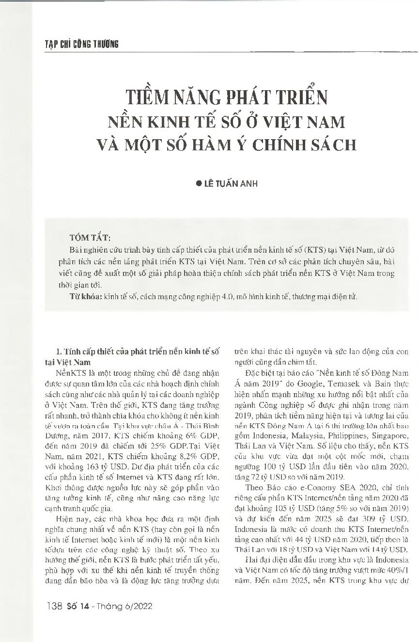 Tiềm năng phát triển nền kinh tế số ở Việt Nam và một số hàm ý chính sách = The potential of developing digital economy in Vietnam and some policy implications