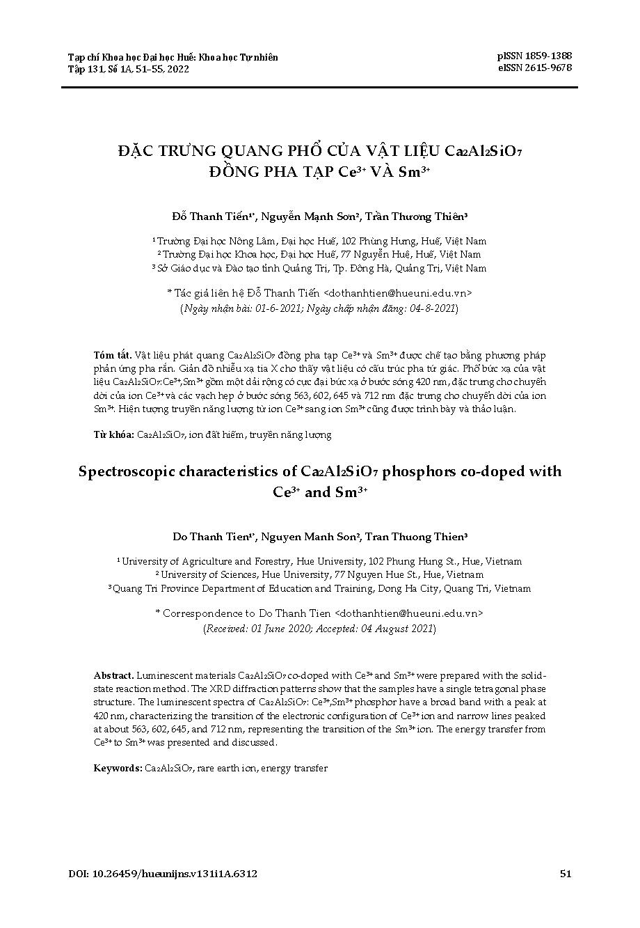 Đặc trưng quang phổ của vật liệu Ca2Al2SiO7 đồng pha tạp Ce3+ và Sm3+ = Spectroscopic characteristics of Ca2Al2SiO7 phosphors co-doped with Ce3+ and Sm3+