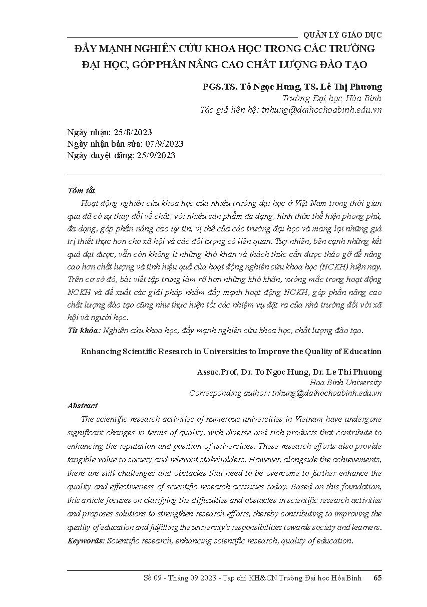 Đẩy mạnh nghiên cứu khoa học trong các trường đại học, góp phần nâng cao chất lượng đào tạo = Enhancing scientific research in universities to improve the quality of education