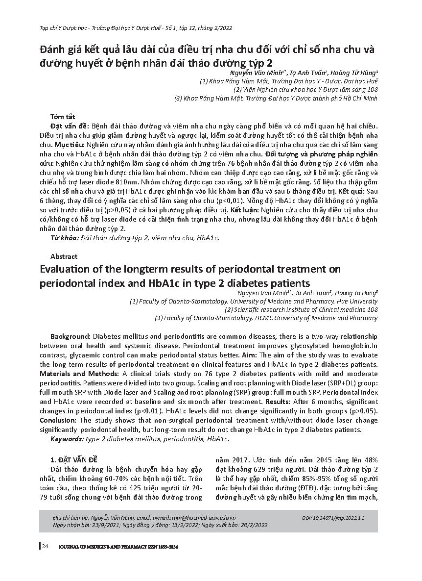 Đánh giá kết quả lâu dài của điều trị nha chu đối với chỉ số nha chu và đường huyết ở bệnh nhân đái tháo đường týp 2 = Evaluation of the longterm results of periodontal treatment on periodontal index and HbA1c in type 2 diabetes patients