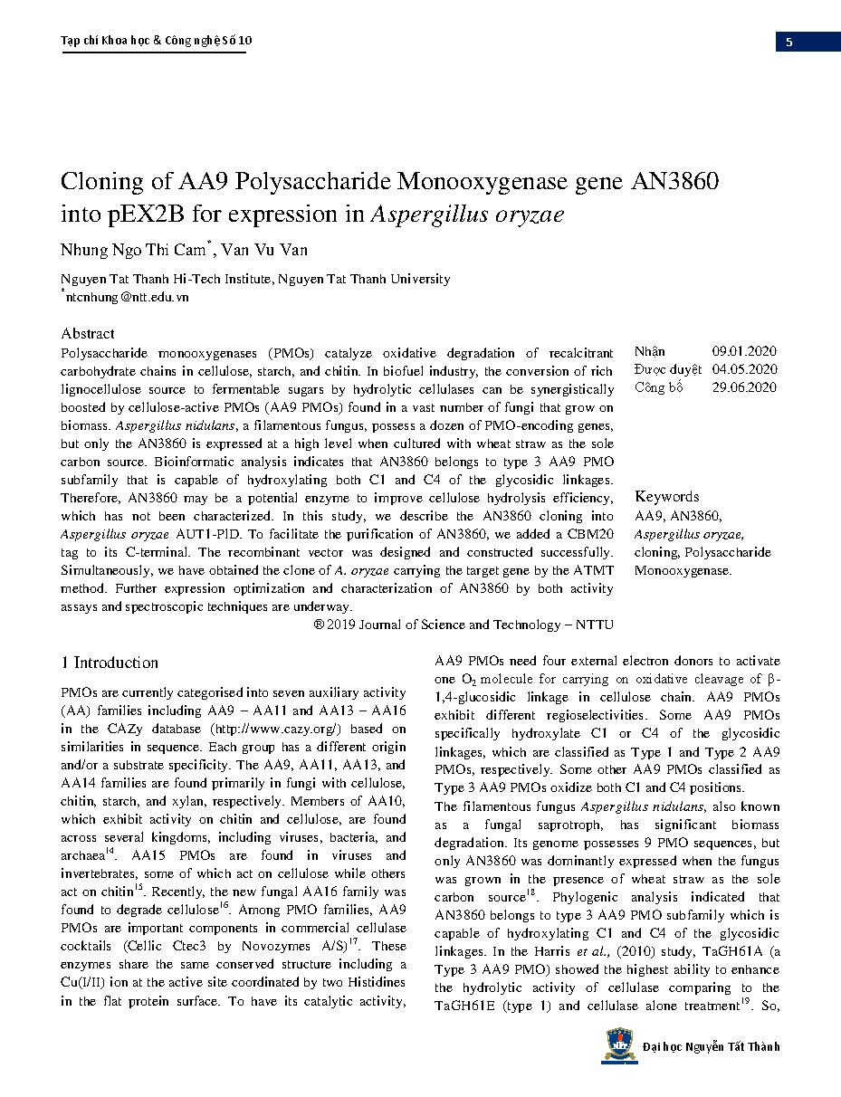 Tạo dòng gen mã hóa enzyme AA9 Polysaccharide Monooxygenase AN3860 trên vector pEX2B hướng tới biểu hiện trên Aspergillus oryzae = Cloning of AA9 Polysaccharide Monooxygenase gene AN3860 into pEX2B for expression in Aspergillus oryzae
