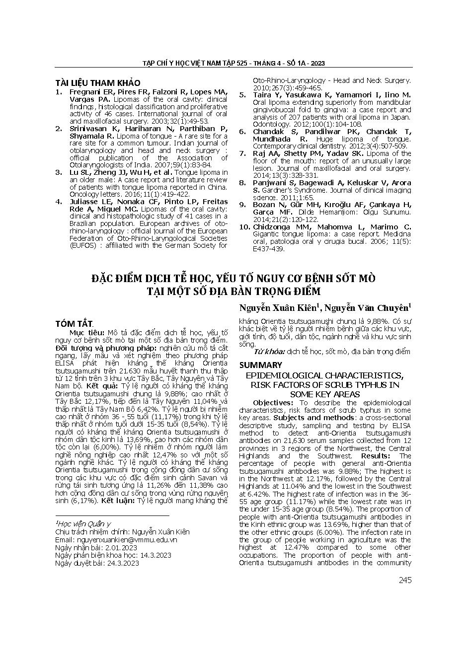 Đặc điểm dịch tễ học, yếu tố nguy cơ bệnh sốt mò tại một số địa bàn trọng điểm = Epidemiological characteristics, risk factors of scrub typhus in some key areas