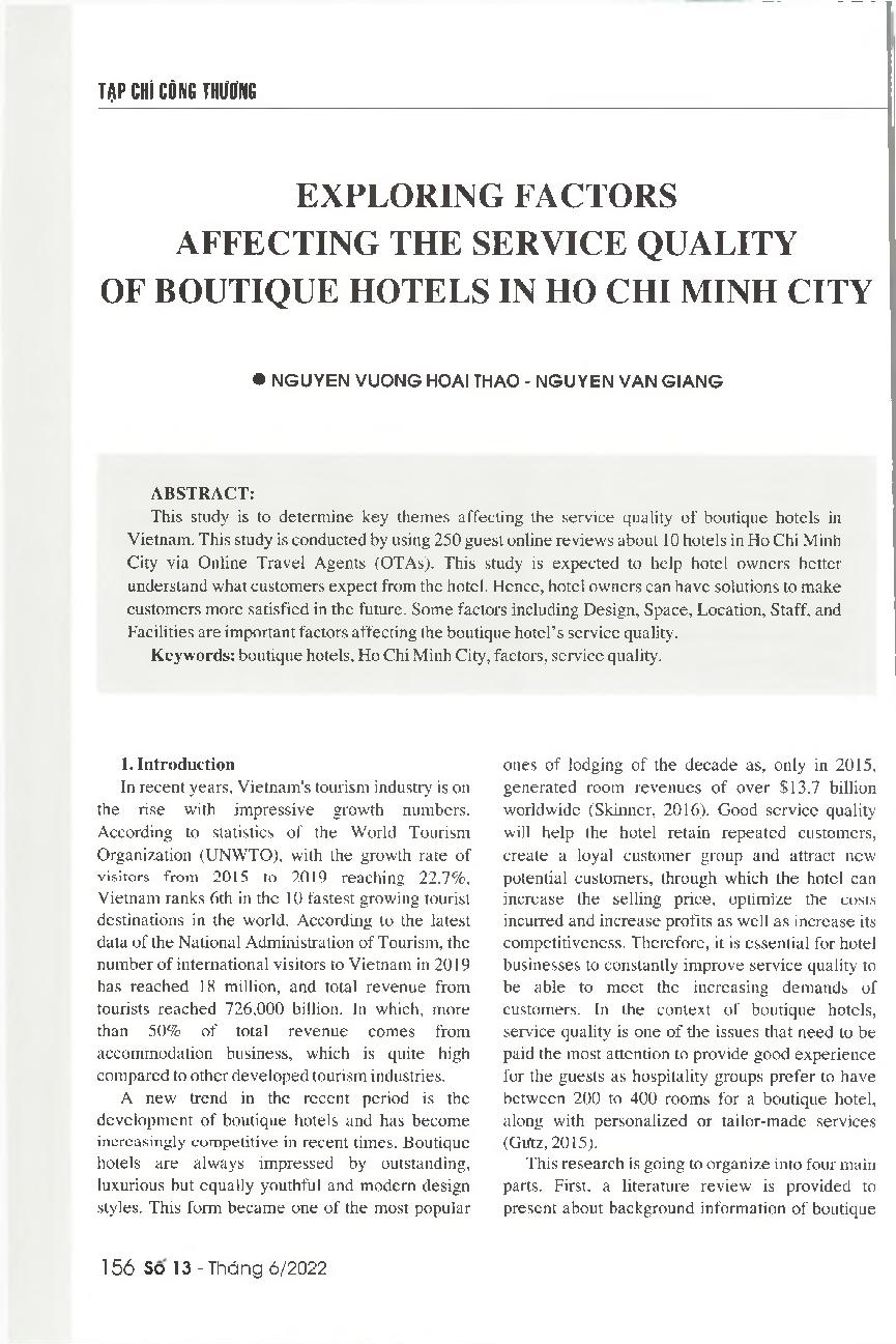 Những yếu tố cần thiết khi đánh giá chất lượng dịch vụ tại các khách sạn boutique tại Thành phố Hồ Chí Minh = Exploring factors affecting the service quality of boutique hotels in Ho Chi Minh City