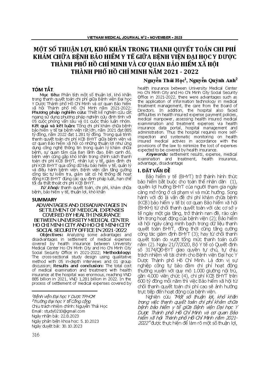 Một số thuận lợi, khó khăn trong thanh quyết toán chi phí khám chữa bệnh bảo hiểm y tế giữa Bệnh viện Đại học Y dược thành phố Hồ Chí Minh và cơ quan bảo hiểm xã hội thành phố Hồ Chí Minh năm 2021 - 2022 = Advantages and disadvantages in settlement of med