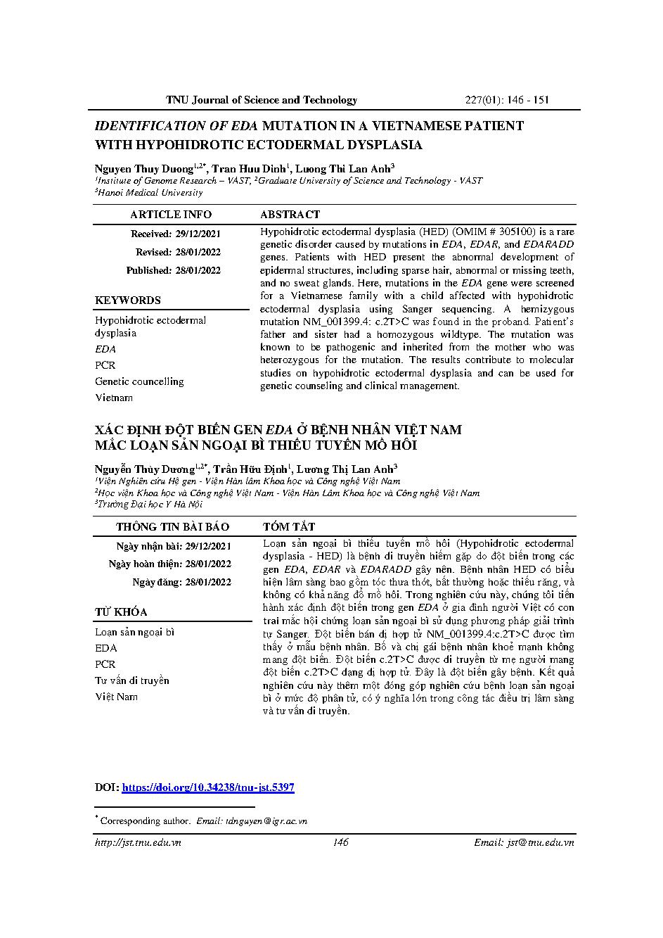 Xác định đột biến gen EDA ở bệnh nhân Việt Nam mắc loạn sản ngoại bì thiếu tuyến mồ hôi = Identification of EDA mutation in a Vietnamese patient with hypohidrotic ectodermal dysplasia