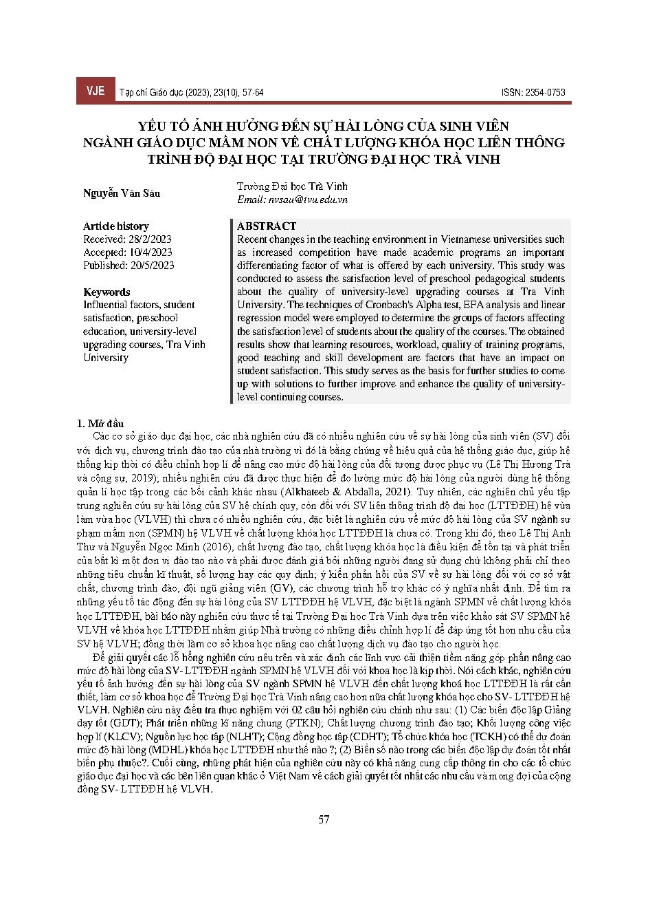 Yếu tố ảnh hưởng đến sự hài lòng của sinh viên ngành Giáo dục mầm non về chất lượng khóa học liên thông trình độ đại học tại Trường Đại học Trà Vinh = Factors affecting the satisfaction of preschool education students about the quality of university-level