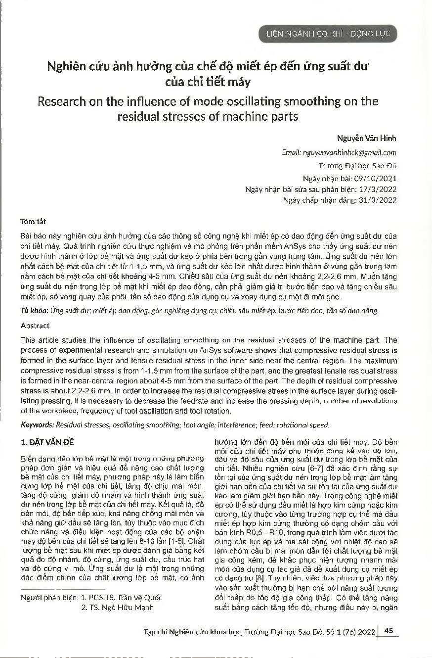 Nghiên cứu ảnh hưởng của chế độ miết ép đến ứng suất dư của chi tiết máy = Research on the influence of mode oscillating smoothing on the residual stresses of machine parts
