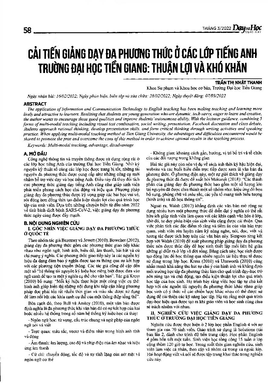 Cải tiến giảng dạy đa phương thức ở các lóp tiếng Anh Trường Đại học Tiền Giang: Thuận lợi và khó khăn = Improving multi-modal teaching in Tien Giang University English classroom: advantages and disadvantages