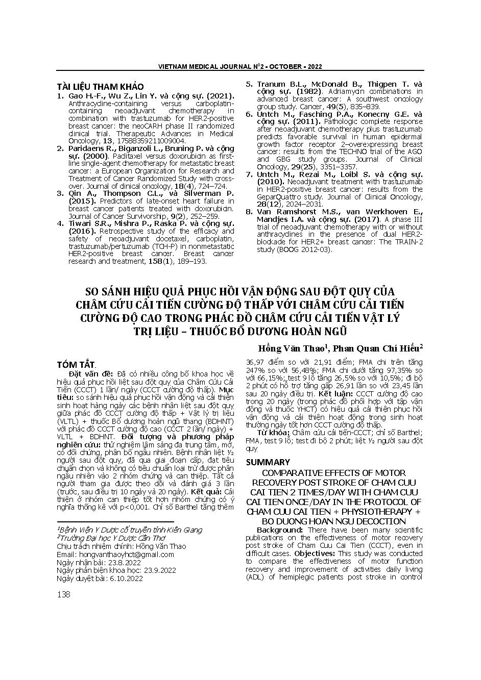 So sánh hiệu quả phục hồi vận động sau đột quỵ của châm cứu cải tiến cường độ thấp với châm cứu cải tiến cường độ cao trong phác đồ châm cứu cải tiến vật lý trị liệu – thuốc bổ dương hoàn ngũ = Comparative effects of motor recovery post stroke of Cham cuu