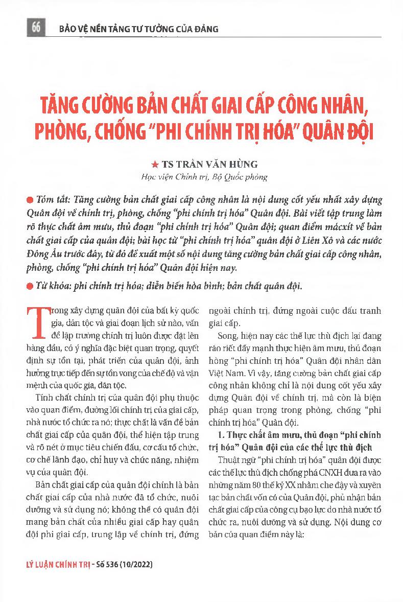 Tăng cường bản chất giai cấp công nhân, phòng, chống “phi chính trị hóa” quân đội = Strengthen the nature of the working class to prevent and combat the “depoliticization” of the military