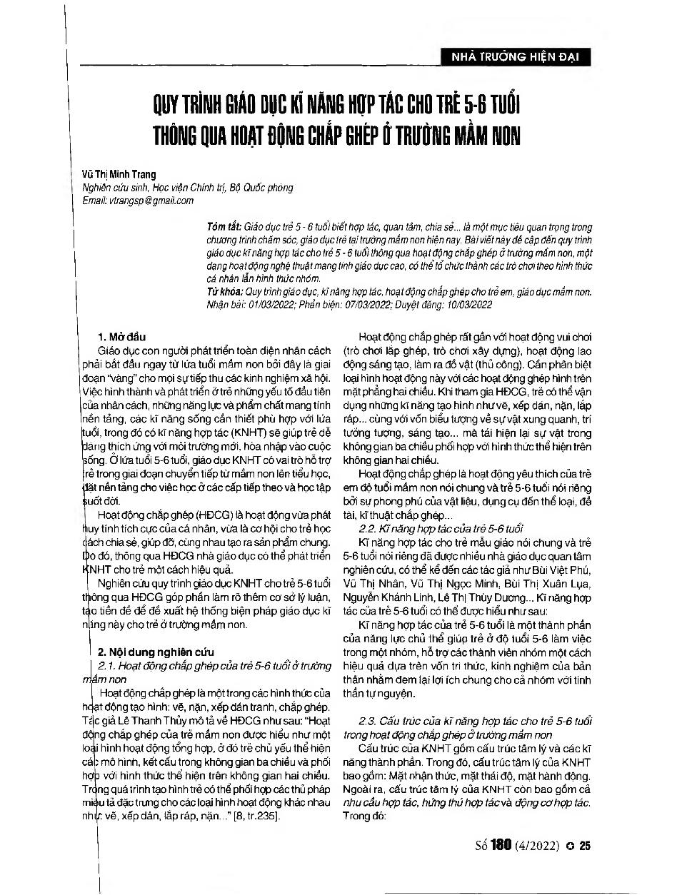 Quy trình giáo dục kỹ năng hợp tác cho trẻ 5-6 tuổi thông qua hoạt động chắp ghép ở trường mầm non = The process of educating cooperative skills for 5-6 years old children through piecing on activities in preschool