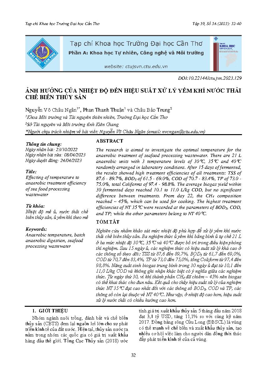 Ảnh hưởng của nhiệt độ đến hiệu suất xử lý yếm khí nước thải chế biến thủy sản = Effecting of temperature to anaerobic treatment efficiency of sea food processing wastewater