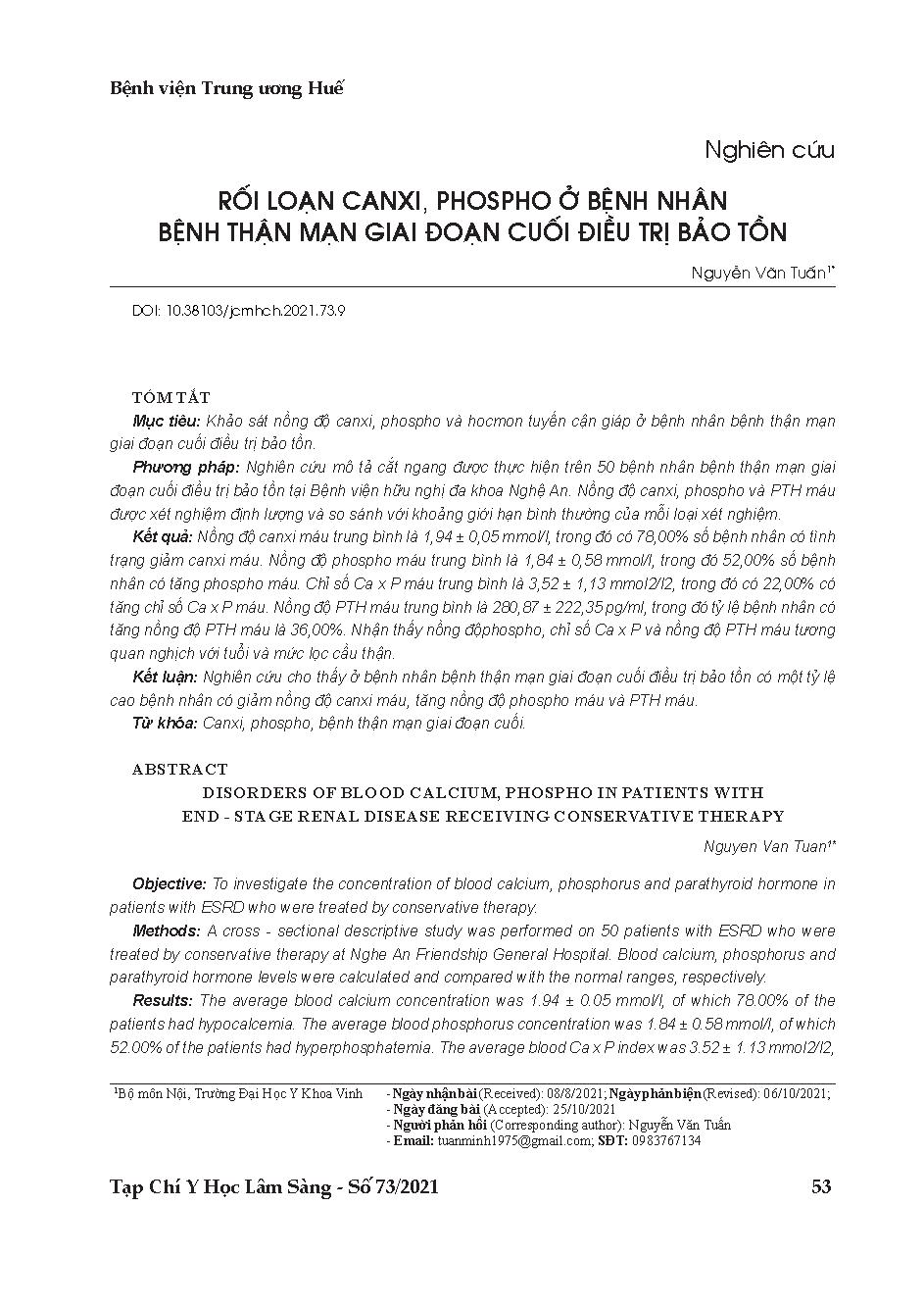 Rối loạn canxi, phospho ở bệnh nhân bệnh thận mạn giai đoạn cuối điều trị bảo tồn = Disorders of blood calcium, phospho in patients with end - stage renal disease receiving conservative therapy