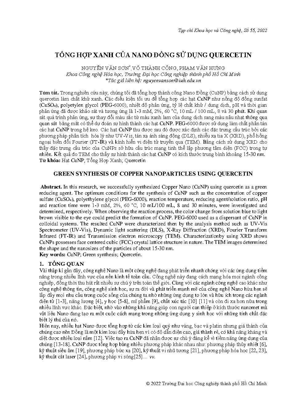 Tổng hợp xanh của nano đồng sử dụng quercetin = Green synthesis of copper nanoparticles using quercetin