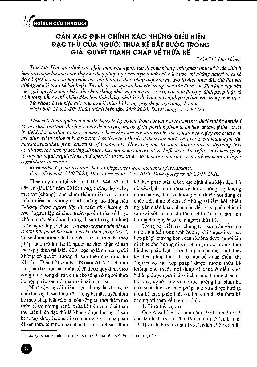 Cần xác định chính xác những điều kiện đặc thù của người thừa kế bắt buộc trong giải quyết tranh chấp về thừa kế = It is necessary to precisely determine typical features of the heirs independent from contents of testaments