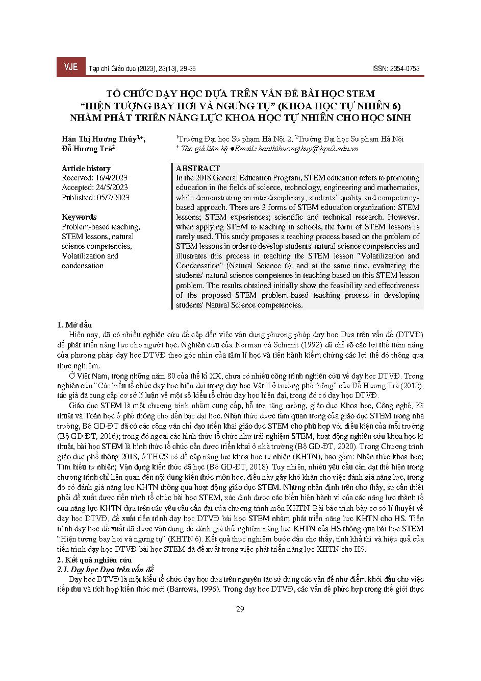 Tổ chức dạy học dựa trên vấn đề bài học STEM "hiện tượng bay hơi và ngưng tụ" (Khoa học tự nhiên 6) nhằm phát triển năng lực khoa học tự nhiên cho học sinh = Organizing teaching problem-based STEM lesson "evaporation and condensation phenomenon" (Natural
